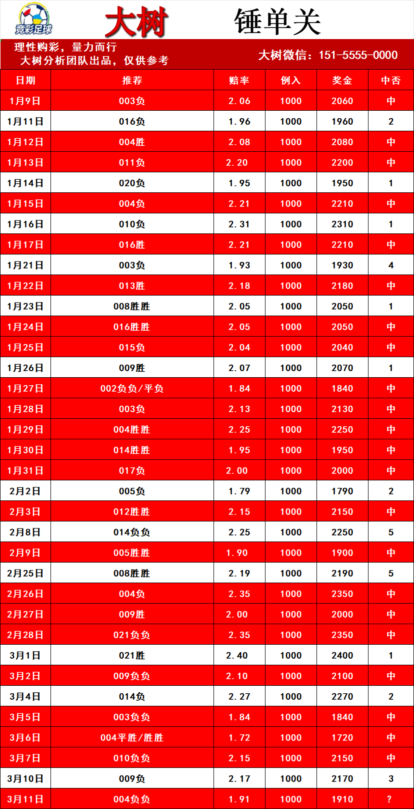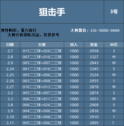 根据自己的资金情况,选择一个推荐单,做好几期计划,一期不中,合理加倍,中一期即盈利!